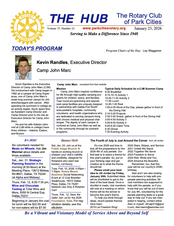 • Saturday, January 24. 9:00am-Noon. Public Image Brunch. Join us for a hands-on working brunch to sharpen your club’s visibility and credibility, designed for Rotarians who want real traction, not theory. At the Movie Institute, Willow Bend Mall, Plano. RSVP to rotary5810.org. Bring your real challenges, stalled ideas, confusing platforms, or content questions, and get direct, actionable input you can use immediately.